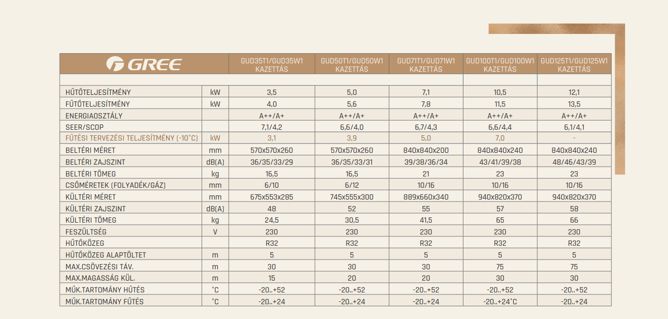A Gree GUD71T / GUD71W Kazettás Split klíma fontos tulajdonságai:
